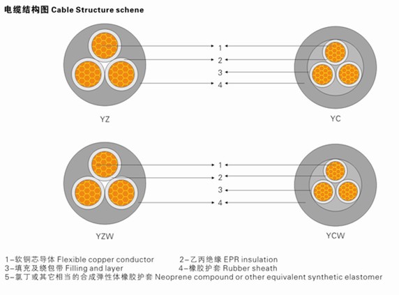 用于各种移动电器设备和工具,能承受较大机械外力作用。W型派生电缆具有耐气候和一定的耐油性能,适宜于户外或接触油污的场合使用。 |