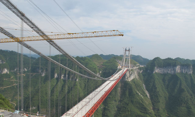 矮寨特大悬索桥,位于湖南湘西矮寨镇境内。矮寨悬索桥,距吉首市区约20公里,跨越矮寨镇附近的山谷,河流经谷底,桥面设计标高与地面高差达330米左右。桥型方案为钢桁加劲梁单跨悬索桥,全长1073.65m,悬索桥的主跨为1176m。该桥跨越矮寨大峡谷,主跨居世界第三、亚洲第一。工程计划投入7.2亿元,占吉茶高速公路计划总投资的15%。2012年3月底,创4项世界第一的湖南矮寨特大悬索桥正式通车。